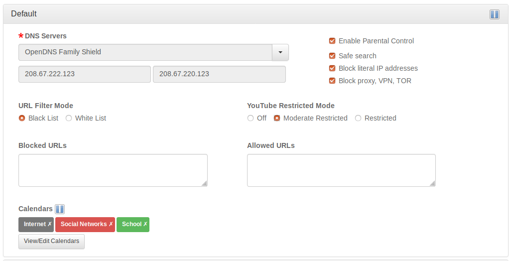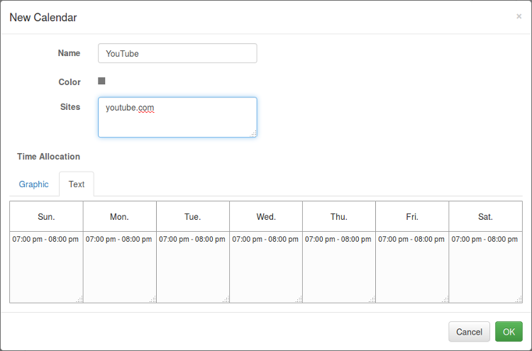 To set time limits for YouTube, create a Calendar, enter the youtube.com domain name, specify what time slots YouTube is available, then Save. In the example shown below, YouTube is available from 7:00pm to 8:00pm everyday. The settings cover both the desktop domain www.youtube.com and mobile domain m.youtube.com.