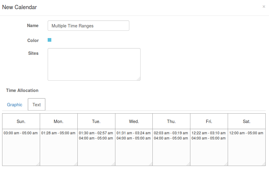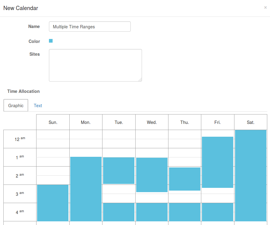 5. In the Time Allocation section, enter the allowed time ranges. For the example below, I entered “12:00am-12:00am”, which means these sites are always available.