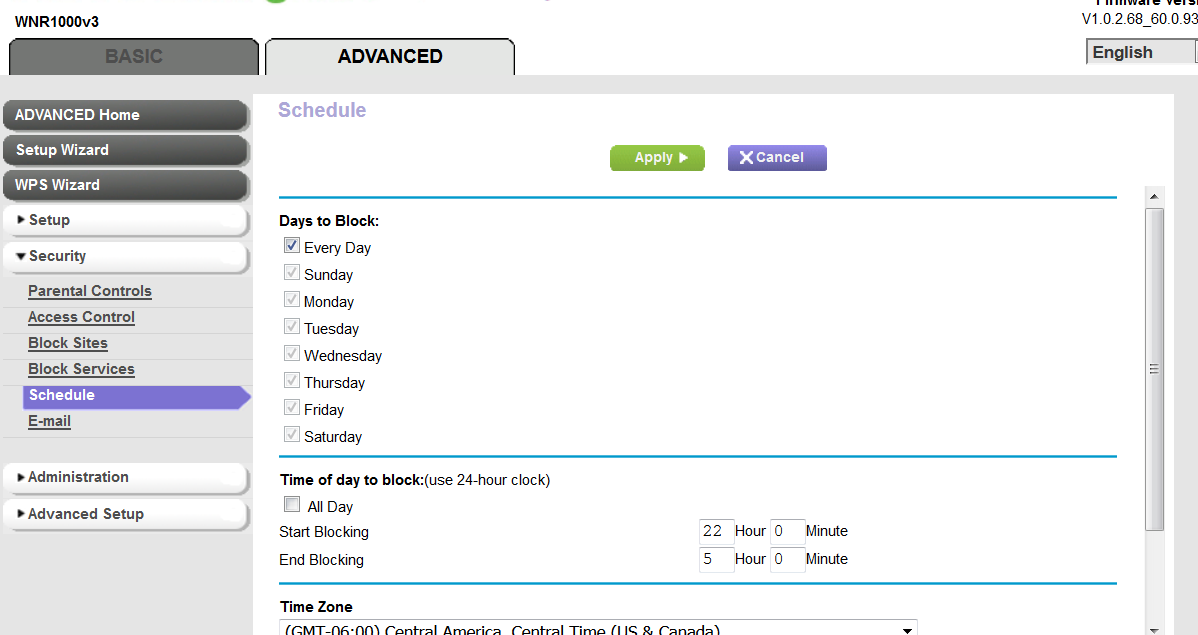 First, you need to set up a schedule. NETGEAR allows you to set up one time block and apply this time block to everyday or the days in a week you choose. In the example below, the start time is 22:00 and the end time is 5:00, because I want to turn off the Internet from 10:00pm the current day till 5:00am the next day.