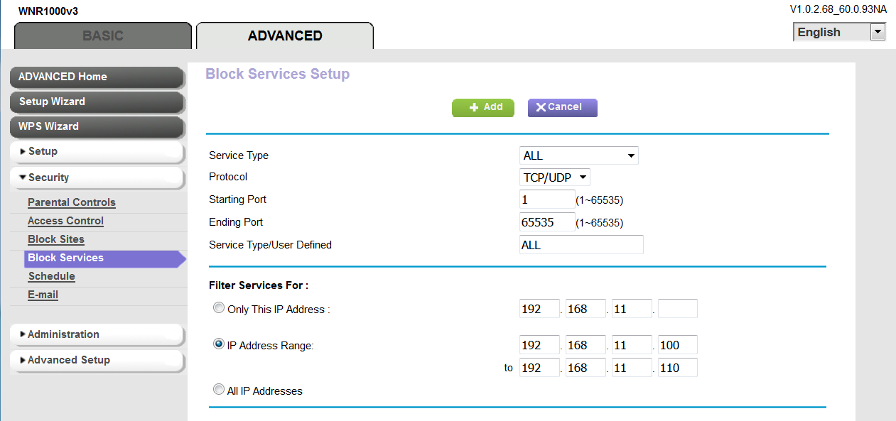 Select ALL in Service Type, TCP/UCP in Protocol, enter the IP Address Range, then click Add.