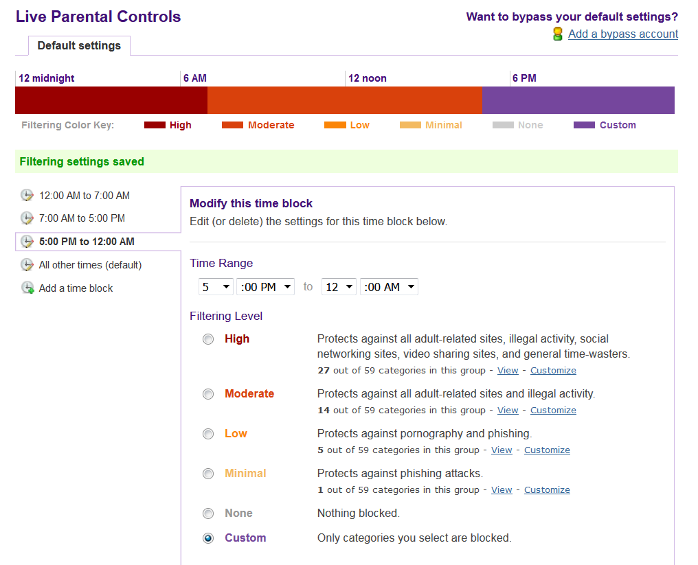 After you land on the OpenDNS page, it will let you set your Internet filtering options. You can even set up different filtering levels for different time ranges. But you can’t completely shutdown the Internet, say after 11:00pm. A workaround would be to use custom filtering for the time range you want to shutdown the Internet. In your custom settings, block all available categories. Although very close, this still doesn’t completely shutdown the Internet, since there are websites not categorized by OpenDNS.