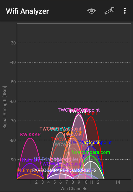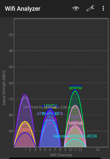 If you have an Android phone, you can download the Wifi Analyzer (farproc) app, which was used to create the pictures in this post. On Windows, there’s NirSoft WifiInfoView.