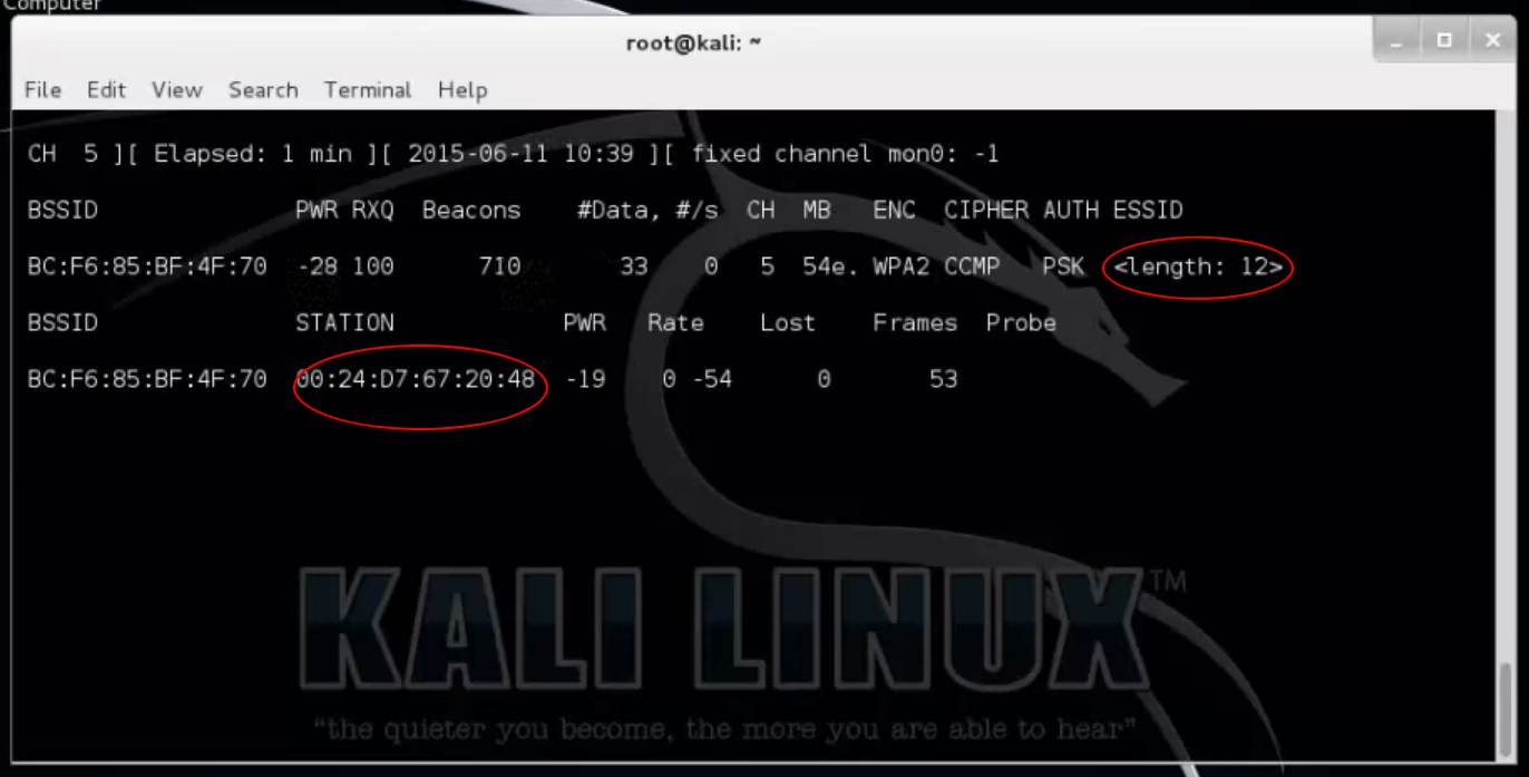 MAC address filtering is viewed as another security measure because it allows you to block or allow WiFi connection based on the MAC address of the device trying to connect. But again, this technique brings only superfluous value as far as securing your WiFi network is concerned. The reason being that it is easy to find out what MAC addresses are allowed by scanning your WiFi, and that it is just as easy to spoof a hacker’s device to take one of the allowed MAC addresses. The picture below shows the MAC address of a device connected to a router with hidden SSID (for which the length is shown), even before the SSID was uncovered.