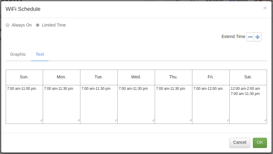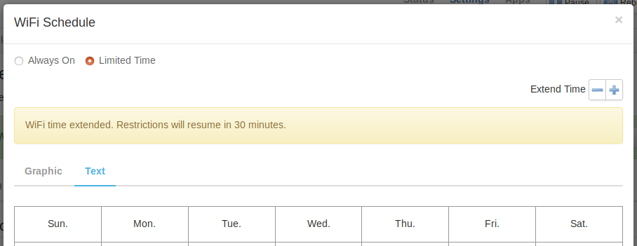 What if you temporarily need WiFi beyond the scheduled cut off time? You can click the +/- buttons on the right of the WiFi schedule dialog to extend WiFi time one-time only.