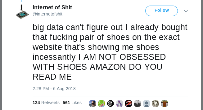 Trust me, those companies take privacy very seriously – their privacy. You see, you looked at the pair of shoes you later bought. The shopping site knew that you looked at the pair of shoes. The advertising network knew that too. But when you bought the pair of shoes, the shopping site kept that a secret. The advertising network didn’t know that, so it followed you around the Internet showing the same pair of shoes you already bought.
