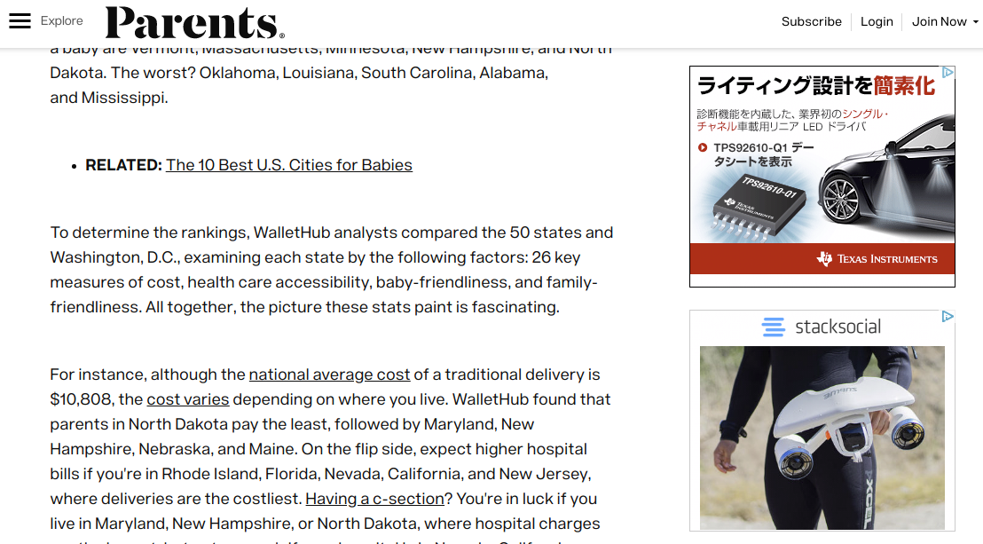 Then I went on to parents.com. After a few clicks, the drone showed up again. This time together with an ad in Japanese. So the advertising networks thought I was in Japan because of the IP address, but they also remembered that I wanted to buy a drone.