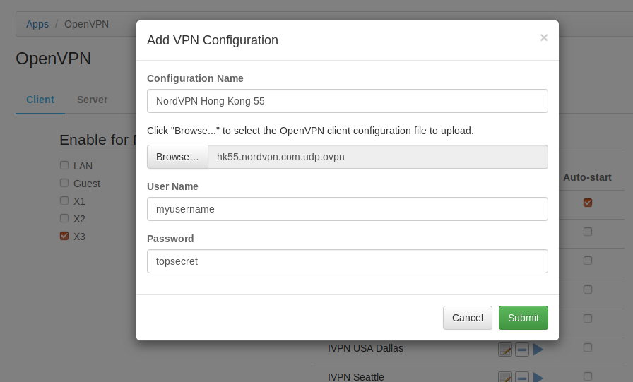 Check the “Auto-start” checkbox if you want the VPN connection to automatically start then the router boots up.