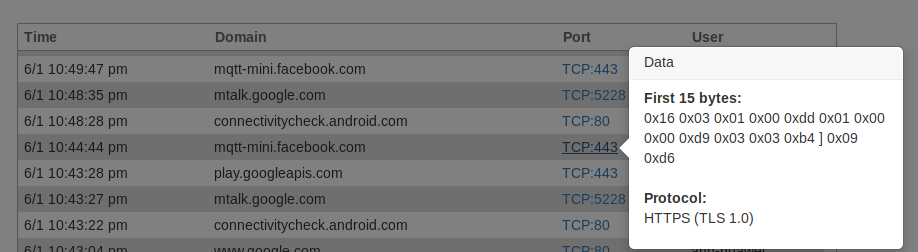 6. Click on the links under the Port column to reveal the first 15 bytes sent over the connection.