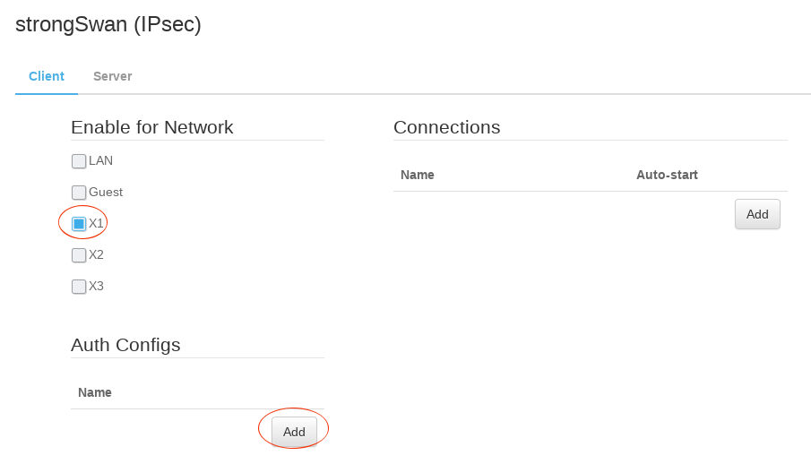 2. Under the Client tab, check the network you want to enable ProtonVPN for, then click the Add button under “Auth Configs” to add a new authentication configuration for ProtonVPN.