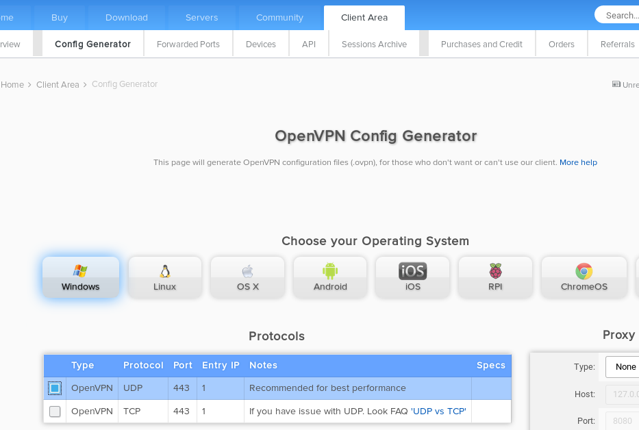 In the client area, go to Config Generator to generate an OpenVPN configuration file.