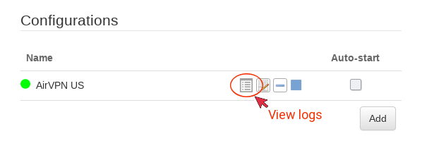 If connection is successful, a green dot will appear on the left of the connection configuration line. In case of connection failure, click on the “log” icon to view OpenVPN logs.