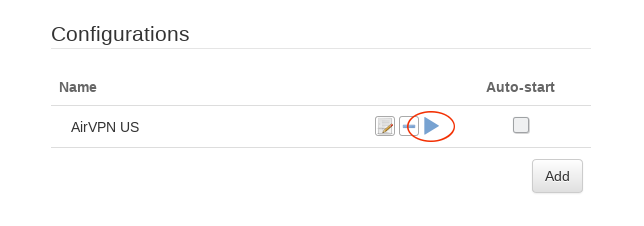 Click on the blue “Play” button to start the AirVPN OpenVPN connection.