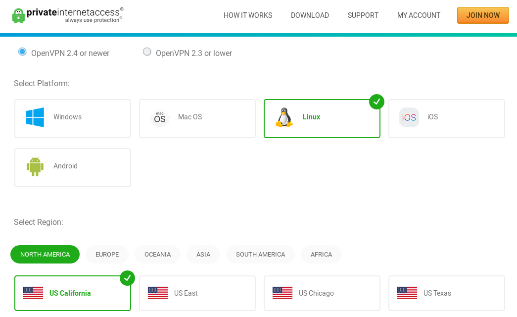 Select Linux and the region for the server you wish to connect to.