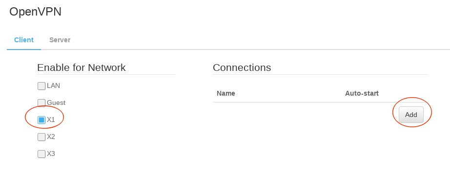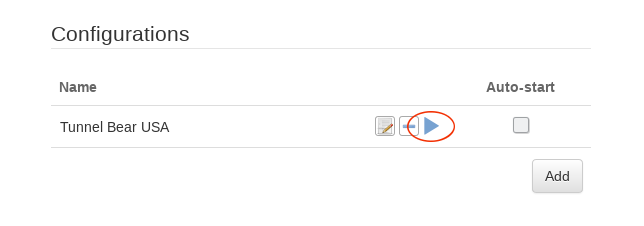 Under the Client tab, check the network you want to enable TunnelBear OpenVPN for, then click the Add button to add a new VPN connection.