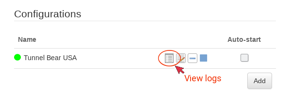 If connection is successful, a green dot will appear on the left of the connection configuration line. In case of connection failure, click on the “log” icon to view OpenVPN logs.