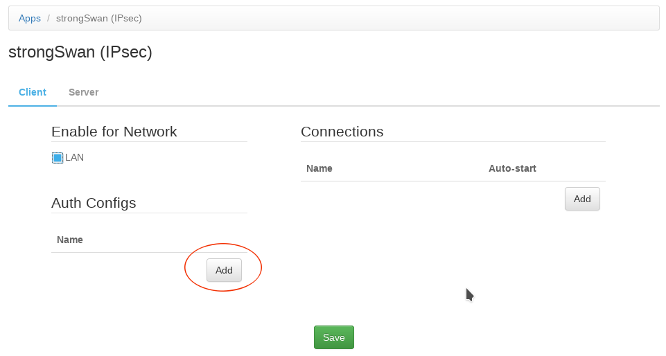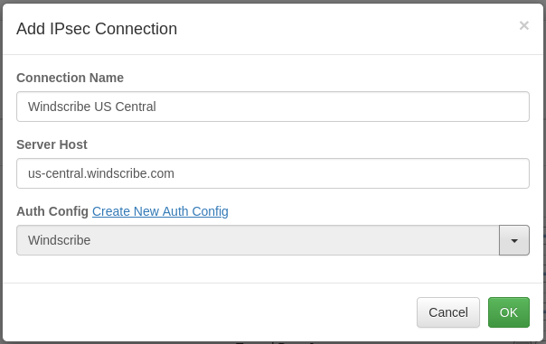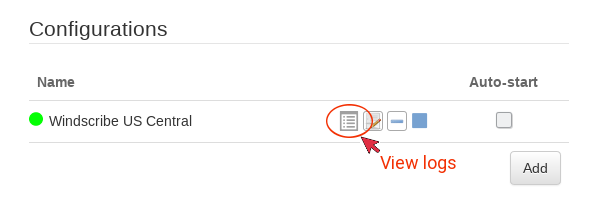 Under the Client tab, check the network you want to enable Windscribe VPN for, then click the Add button under “Auth Configs” to add a new authentication configuration for Windscribe VPN.
