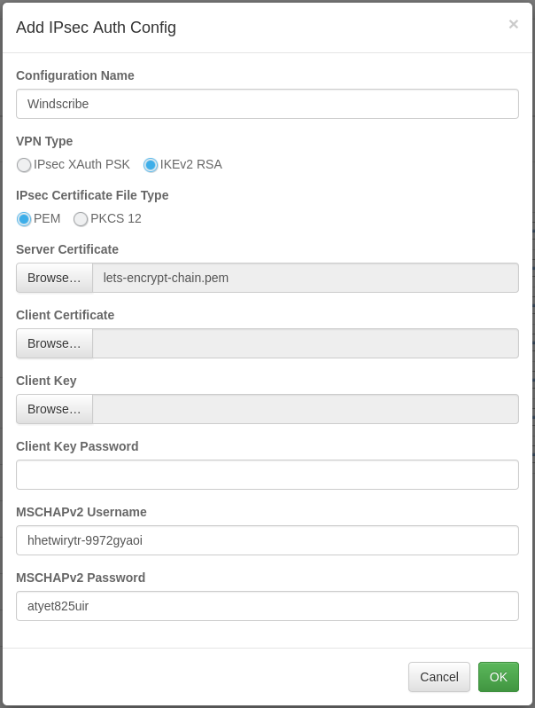 Enter your Windscribe IKEv2 username and password in the MSCHAPv2 username & password fields.