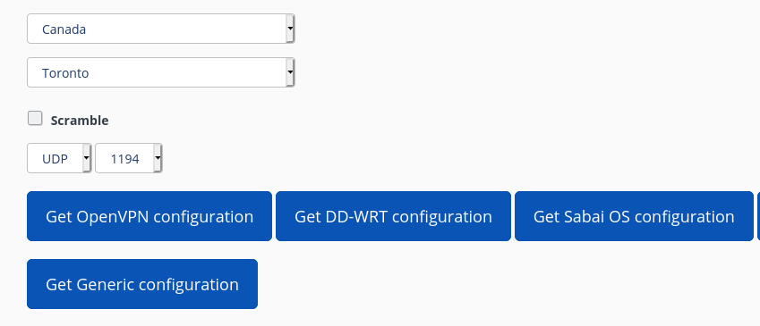Select country, city, protocol & port. You may choose to check Scramble or leave it unchecked. Click Get OpenVPN Configuration to download the OpenVPN configuration file.