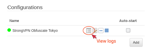 If the connection is successful, a green dot will appear on the left of the connection configuration line. In case of a connection failure, click on the “log” icon to view OpenVPN logs.
