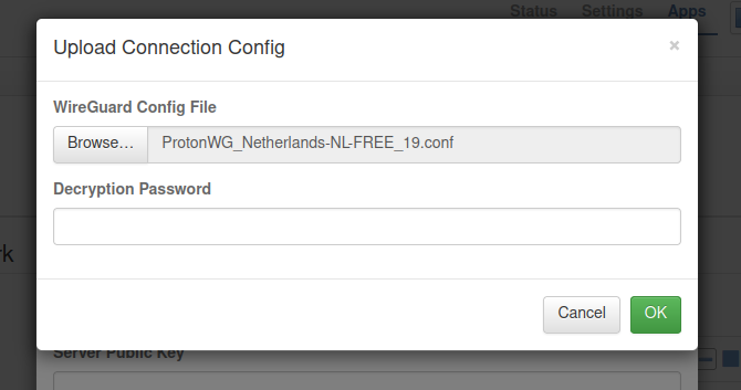 In the popup dialog, click on Upload WireGuard Config.