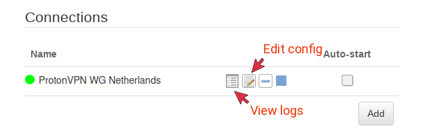 If the connection is successful, a green dot will appear on the left of the connection configuration line. In case of a connection failure, click on the “log” icon to view WireGuard logs. Click on the Edit button to double check the server hostname, client and server keys, client IP address etc.