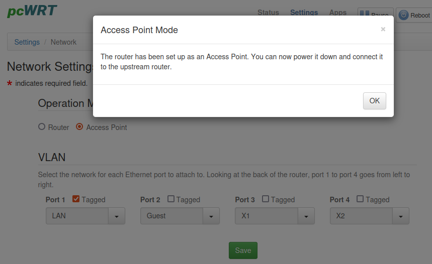 The pcWRT routers allows you to create multiple WiFi SSIDs and assign each to a different VLAN, which improves your network security by segregating different devices to different VLANs. By following the steps shown here, you can set up a secondary pcWRT router as a WiFi Access Point (AP) to extend the WiFi range, with full support for VLAN configurations.