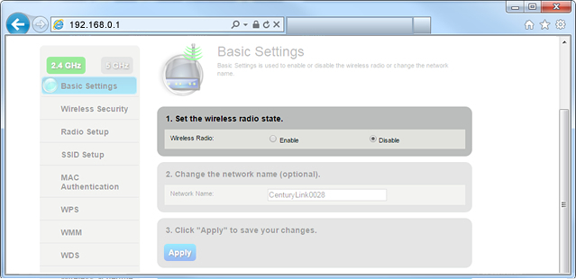 Home › Forums › General Configuration › How to disable wifi for CenturyLink router