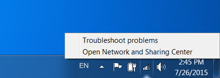1. Mouse over the network icon on the task bar, i.e., the “bars” icon. Right click, then select Open Networking and Sharing Center.